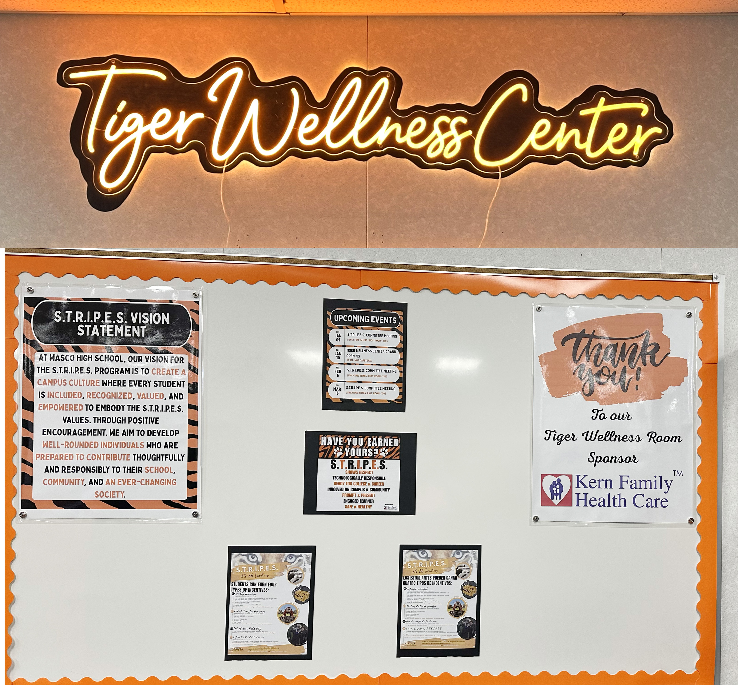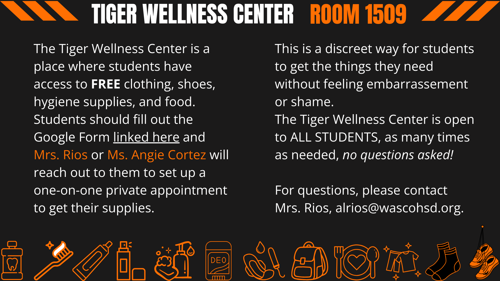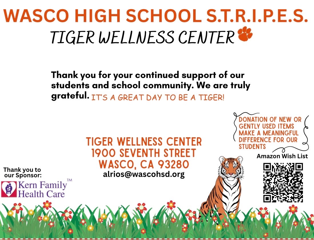 The Tiger Wellness Center (WUHS Room 1509) is an on-campus resource where Wasco Union High School students can receive free clothing, shoes, hygiene items, and food. The Center also houses Tilly’s Closet, which offers formal dresses, men’s attire, and heels—all available at no cost.